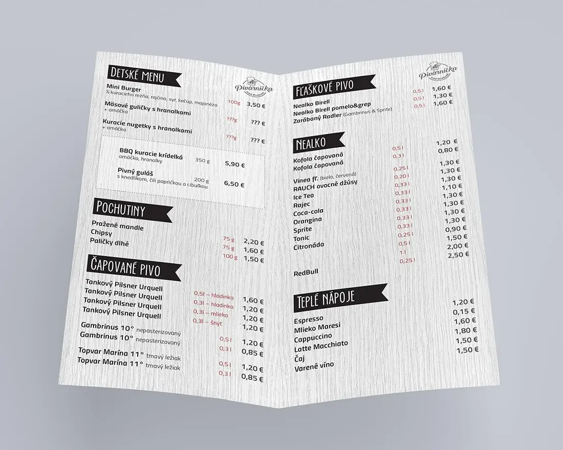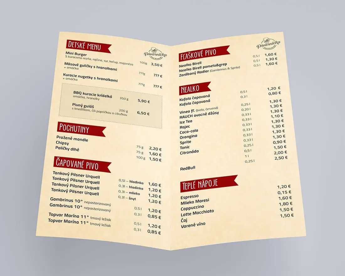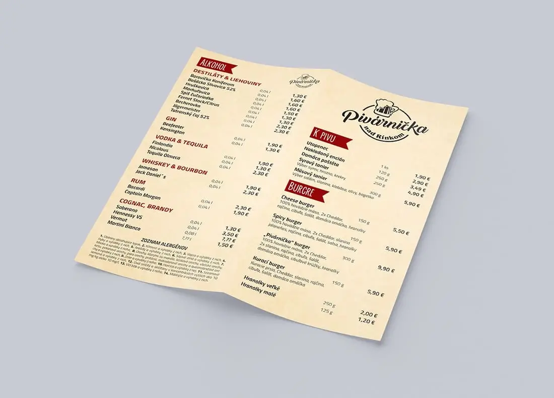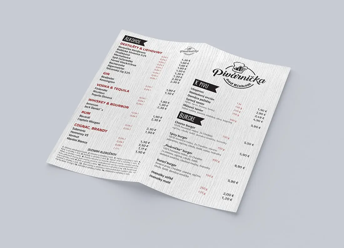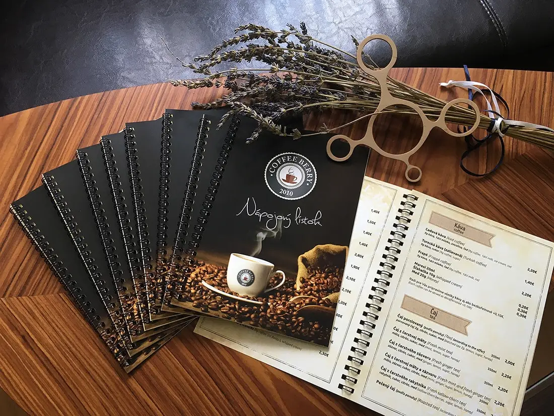 Nápojový lístok alebo jedálny lístok Vám vytlačíme z Vašej predlohy pripravenej grafikom alebo Vám vyhotovíme nový grafický návrh.