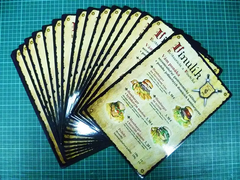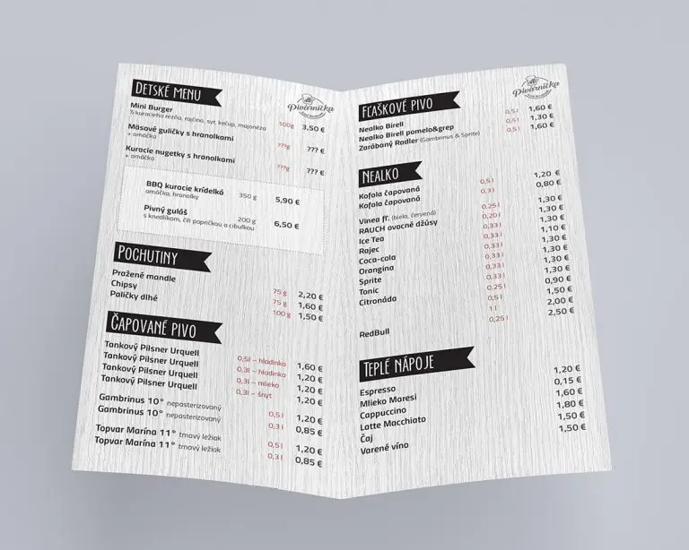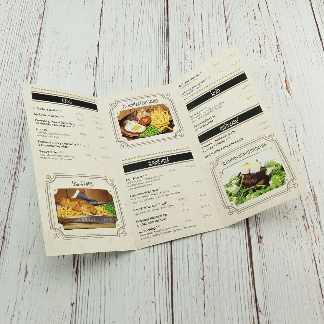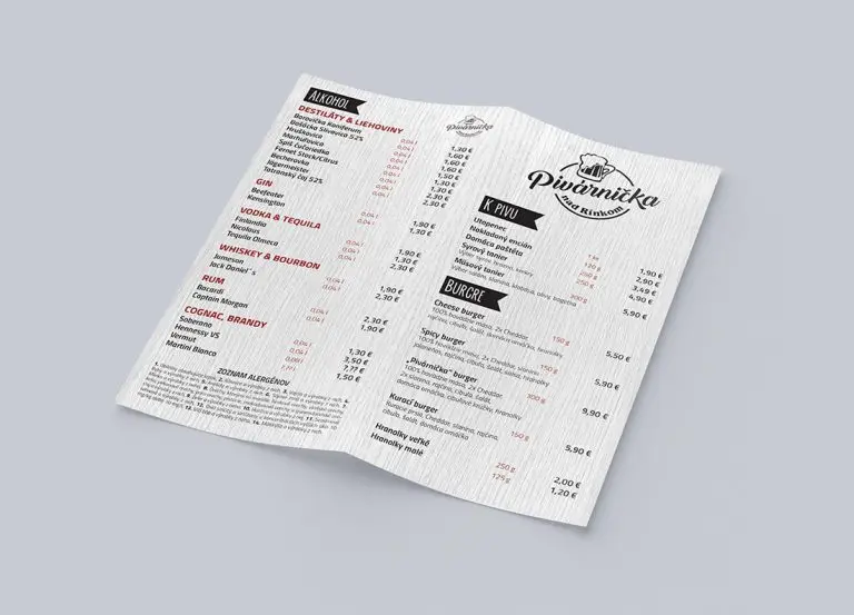 Nápojový, či jedálny lístok tlačíme na kvalitný matný alebo lesklý papier gramáže 200 – 350g/m2. Na základe požiadaviek vieme použiť aj iné kreatívne papiere. Podľa vyťaženia lístkov alebo frekvencie obmienania zvolíme povrchovú úpravu – s lamináciou alebo bez. Prednú a zadnú stranu vieme vyhotoviť z dreva, do ktorého sa vygravíruje Vaše logo. Takýto ponukový lístok pôsobí elegantne a taktiež je odolnejší ako klasický papierový.