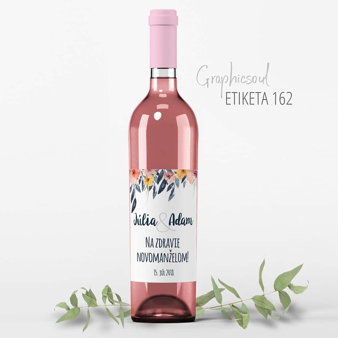 Nechajte rozkvitnúť každú fľašu s touto nádhernou nálepkou plnou voňavých kvetov. Krásny romantický dizajn doplníme o Vaše mená, krátky textík a Váš veľký dátum a vínová fľaša sa hneď stane umeleckým kúskom.