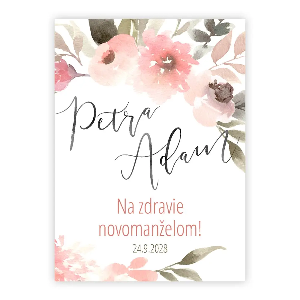 Nálepka na fľašu s motívom divokej šípkovej ruže je top nielen pre Šípkové Ruženky. Hodí sa k romantickým svadbám ladeným do odtieňov smotanovej a staroružovej. Doplníme Vaše mená, krátky textík a príťažlivý dizajn je na svete. Z každej fľaše sa hneď stane reprezentatívny kúsok.