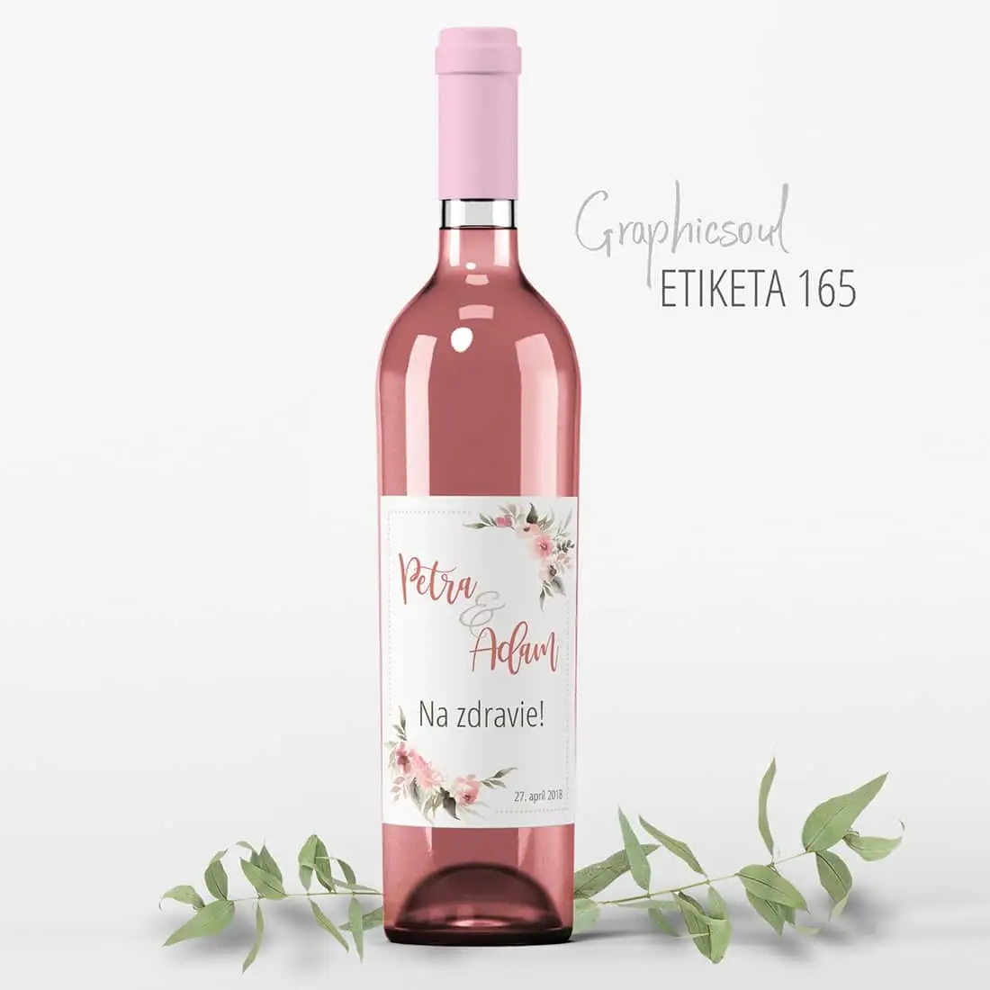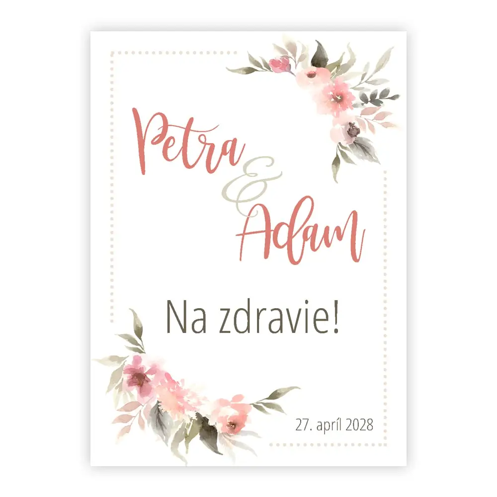 Romantický nežný dizajn s kvietkami, ktoré rozkvitajú v dvoch rohoch etikety, to bude to pravé orechové. Na bielej ploche uprostred sa budú krásne vynímať mená novomanželov, krátky textík podľa Vášho želania a, samozrejme, TEN dôležitý dátum.