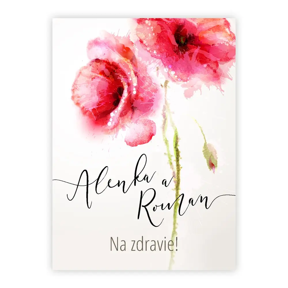 Veľmi obľúbeným motívom letných svadieb sú divoké a vášnivé maky. Tie môžu rozkvitnúť na fľašiach s vínom na Vašej svadbe a pritiahnuť pohľady. Doplníme Vaše meno, text podľa želania a umelecký klenot je na svete.
