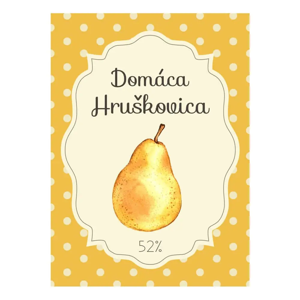 Etikety na alkohol (hruškovicu) – na domácu pálenku sú tlačené na vysoko odolnú samolepiacu fóliu, v matnom alebo lesklom prevedení, vhodnú do exteriéru alebo do vedra s ľadom, prípadne na transparentnú (priesvitnú, priehľadnú) fóliu.