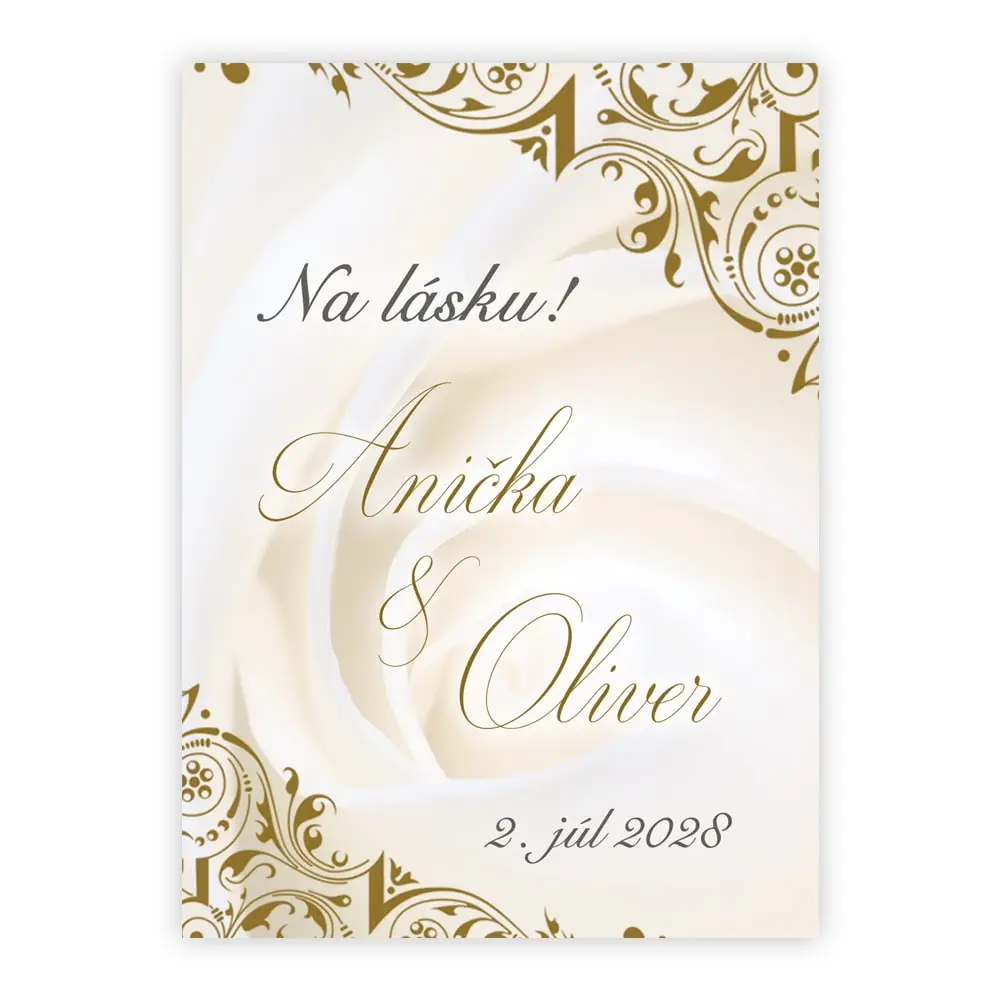 Vyberte si svadobné etikety s jednoduchým simple dizajnom, na ktorom sa budú krásne vynímať Vaše mená. Doplníme aj textík podľa vášho želania. Romantika a noblesa zaručená.