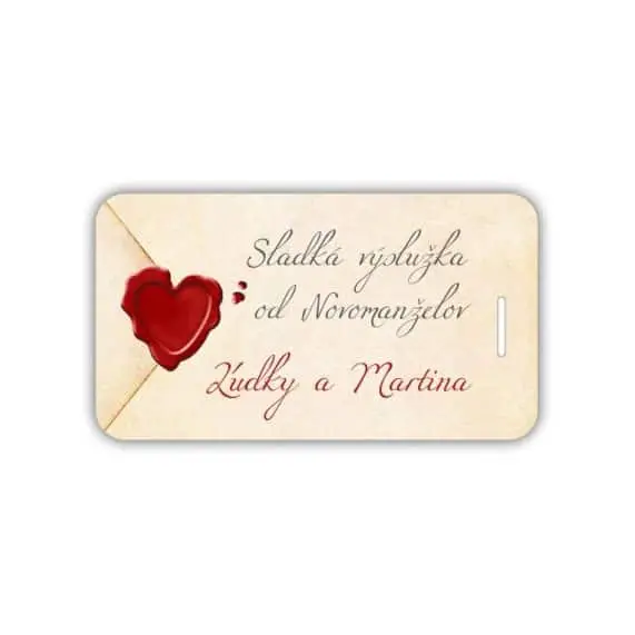 Kartička na výslužkové krabice s koláčmi. Prevedenie si môžete vybrať: papierová kartička s výsekom na stužku alebo papierová samolepka, s ostrými rohmi alebo zaoblenými. Veľkosť kartičky je 9 x 5 cm. Ku kartičkám je možné zladiť aj iné tlačoviny – svadobné oznámenia, pozvánky k stolu, etikety na fľaše, menovky či menu karty tak, aby boli vyhotovené v rovnakom dizajne a celá svadba sa mohla niesť v jednom duchu.