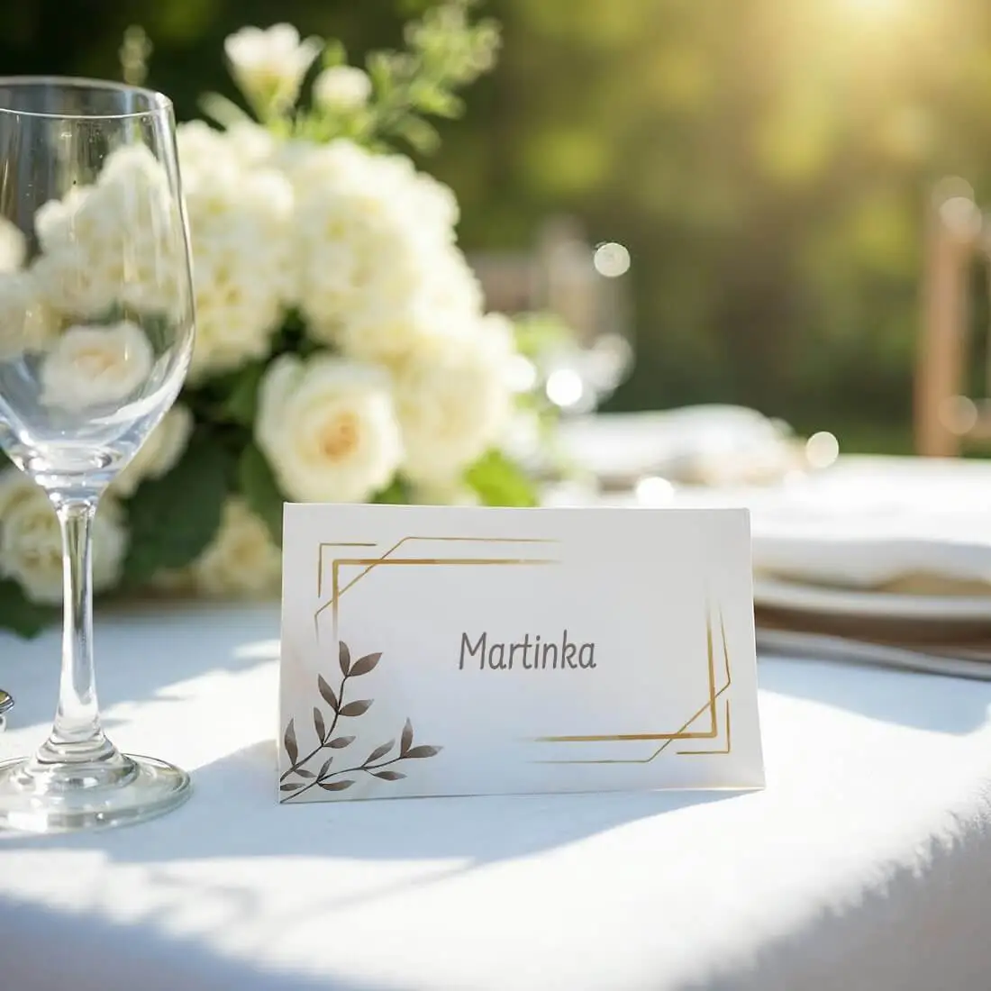 Elegantná menovka na stôl so zlatými detailmi a prírodným motívom je ideálna na svadby, oslavy a špeciálne udalosti. Možnosť personalizácie textu a dizajnu.