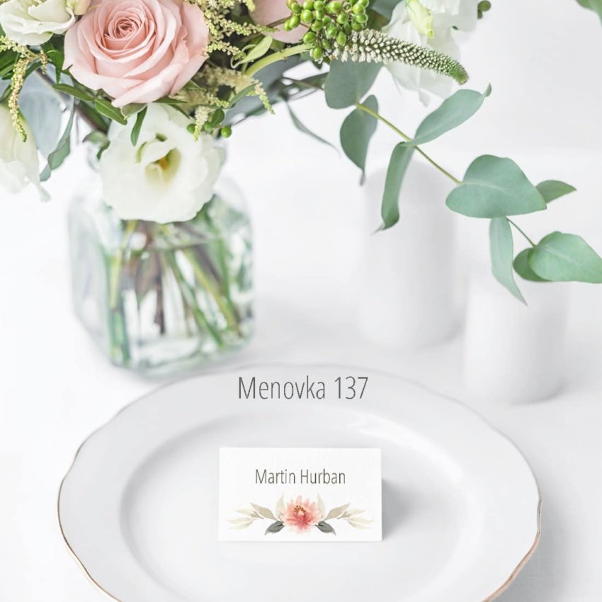 Svadobné menovky s nežným kvetinovým motívom v tlmených farbách sú skvelé riešenie, ktoré prispeje k romantike Vašej svadobnej výzdoby. Hodia sa prakticky k akejkoľvek výzdobe ladenej do prírodných pastelových tónov. Nerušivé a pôsobivé. V hosťoch zanechajú takéto menovky ten najlepší dojem. Odporúčame zladiť aj so svadobnými oznámeniami a etiketami na fľaše. Ak ste si z našich motívov nevybrali, vytlačíme Vám aj Váš vlastný návrh.