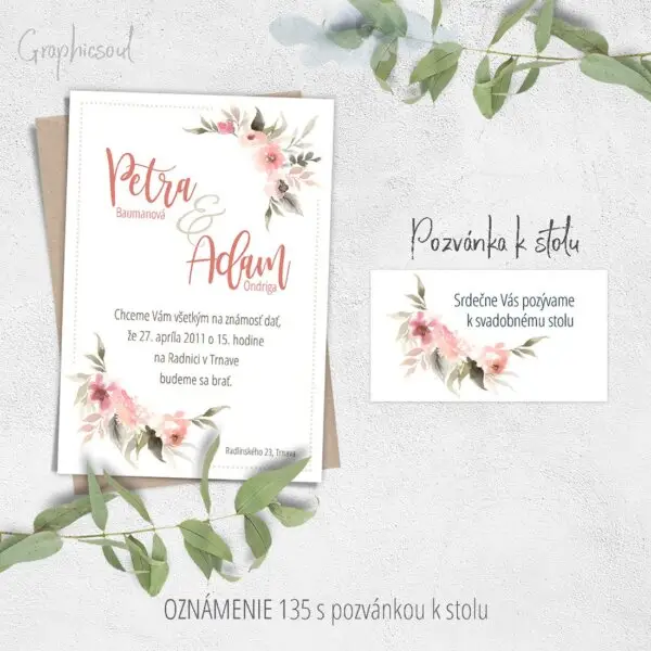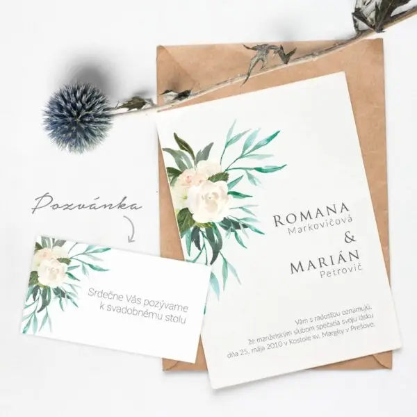 Nechajte si vyrobiť dokonalú pozvánku k svadobnému stolu. Vizuálne pútavú, s jemným, moderným a sofistikovaným dizajnom. Dolaďte svoje svadobné oznámenie pozvánkami k svadobnému stolu v rovnakom štýle – romantickom a nežnom. Jemný kvetinový motív v tlmených pastelových odtieňoch a krásny, čistý výsledný dojem. Dokonalá pozvánka pre romantické svadby, kde to rozvoniava kvetmi.