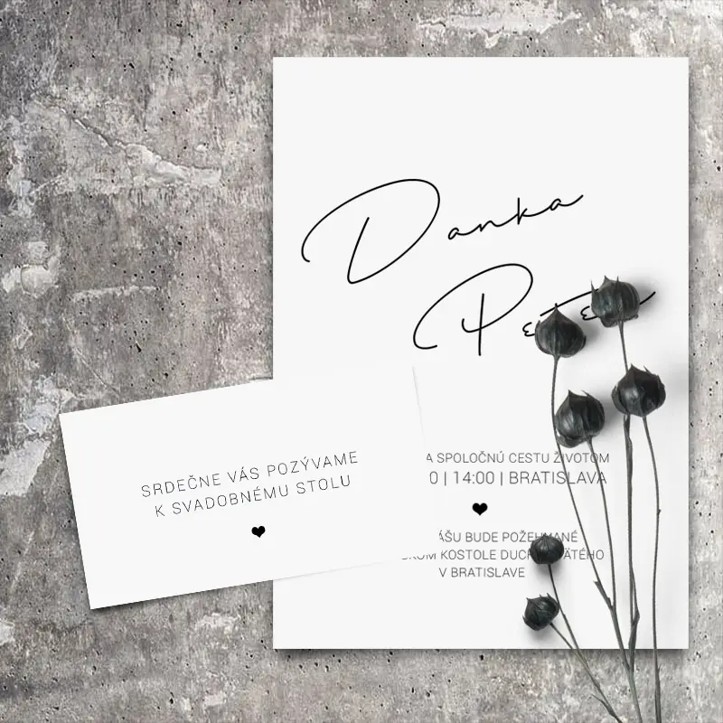 Netradičný, kreatívny a moderný dizajn pozvánky k stolu. K pozvánkam sú zladené aj ostatné svadobné tlačoviny, ako svadobné oznámenie, etikety na fľaše, menovky, menu karty a ďalšie, ktoré nájdete nižšie ako súvisiace produkty.