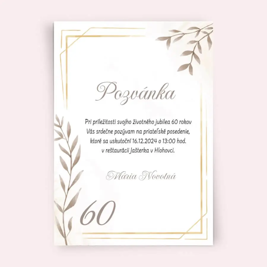 Elegantná pozvánka na oslavu narodenín s vymeniteľným textom veľkosti A6 (105 × 148mm). Texty, obrázky a čísla si môžete jednoducho upraviť pomocou editora, alebo Vám ich upraví náš grafik. Rýchle dodanie do 3 pracovných dní.