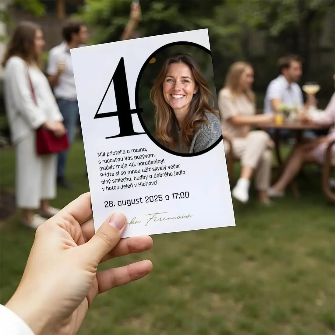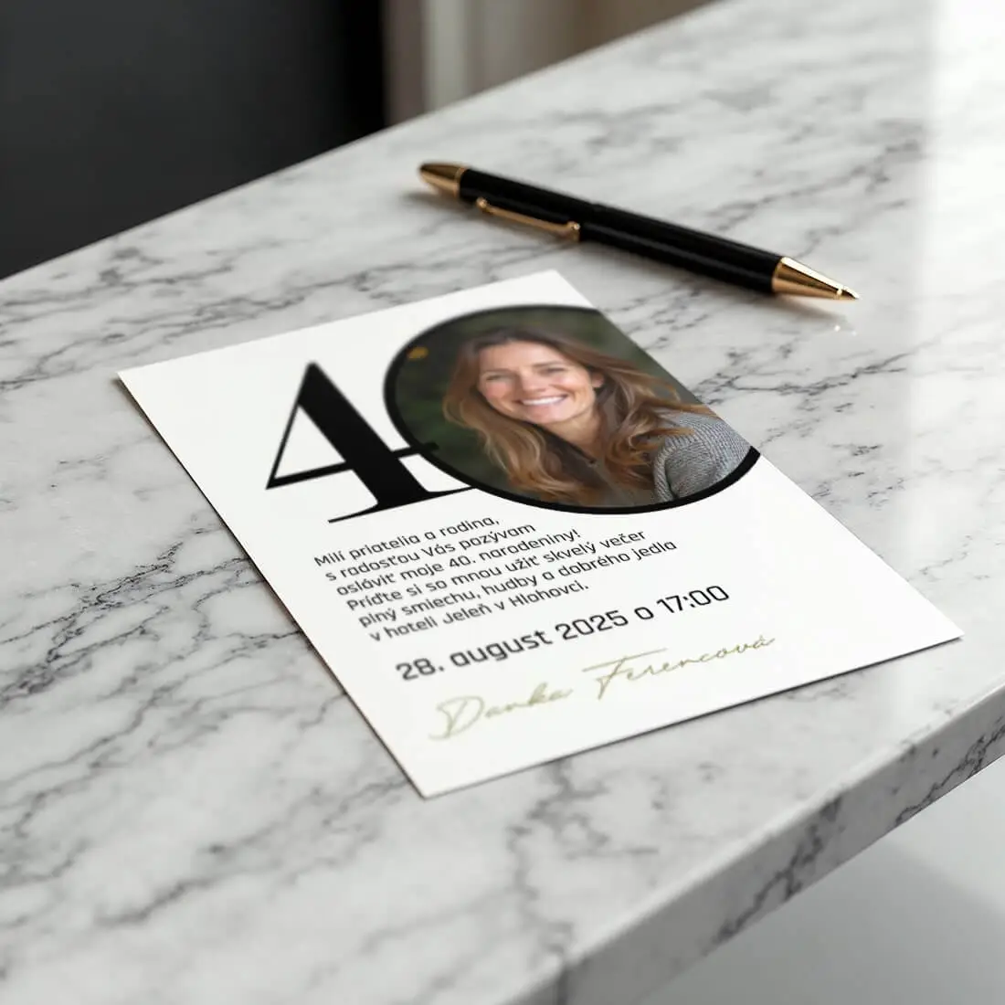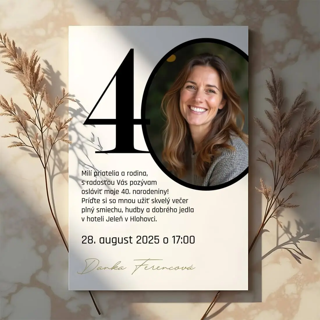Oslávte svoje narodeniny štýlovo! Táto moderná pozvánka je ideálna nielen na 40. narodeniny, ale aj na 50., 60., 70. či 80. jubileum. Elegantný dizajn s veľkým číslom a personalizovanou fotografiou dodá Vášmu pozvaniu jedinečný šmrnc.