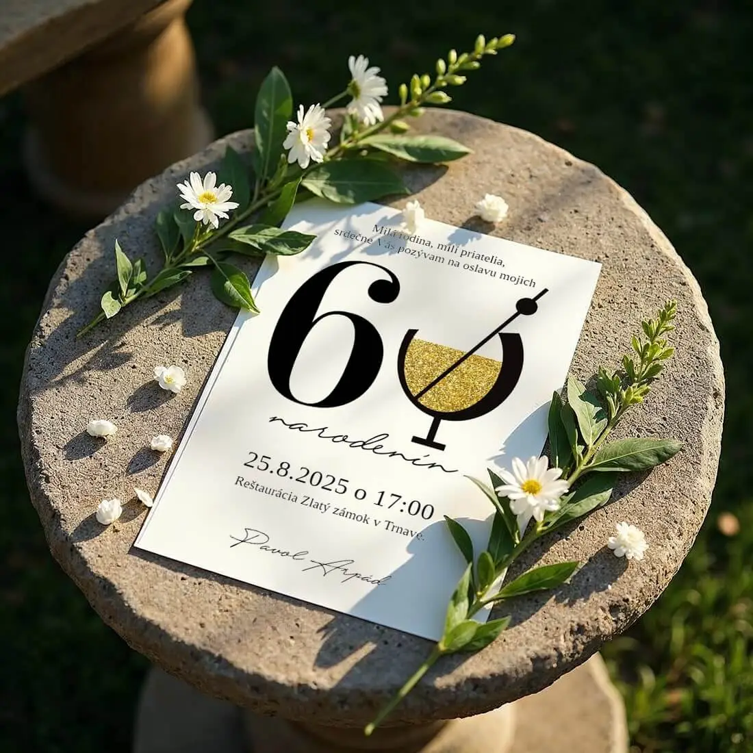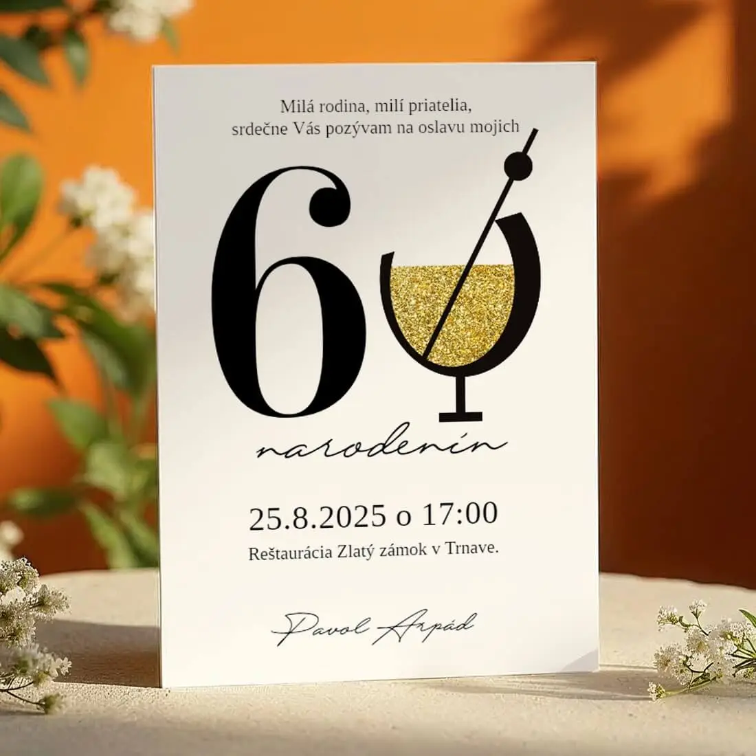 Vytvorte si originálnu pozvánku na oslavu jubilea (40, 50, 60, 70, 80, 90) rýchlo a jednoducho. Stačí použiť náš online editor alebo využiť bezplatnú pomoc grafika. Elegantný dizajn s pohárom a výrazným číslom narodenín zaručí, že vaša pozvánka bude pôsobiť štýlovo a profesionálne.