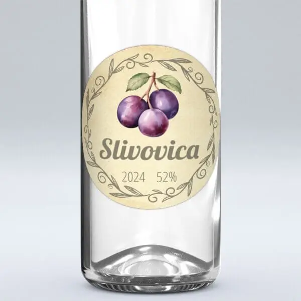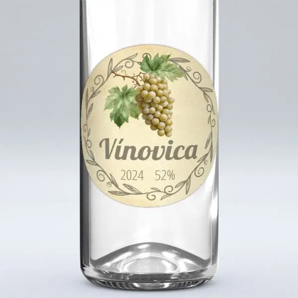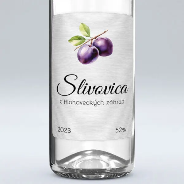 Priesvitná samolepiaca etiketa na domáci alkohol, ktorú tlačíme na kvalitnú transparentnú fóliu vhodnú do vlhkých priestorov. Použitá dvojitá tlač pre sýtejšie farby. Odporúčame použiť len pre bezfarebný alkohol a na priehľadné fľaše. V editore si môžete jednoducho zmeniť texty, prípadne pridať obrázky. Neodporúčame však vkladať pozadia, nakoľko by priesvitnosť etikety stratila zmysel. Farby tlačíme dvojitou farbou pre vyššiu sýtosť na priehľadnej fľaši.