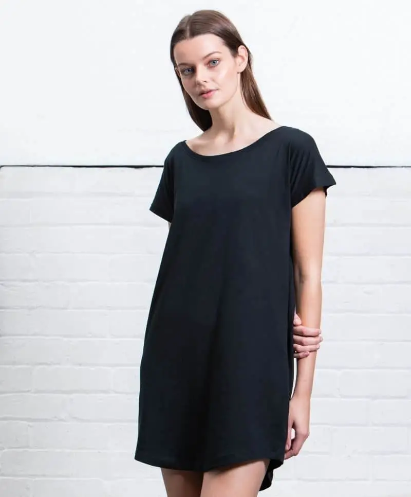 Voľný rovný strih, široký výstrih, zaoblený lem, končí nad kolenami