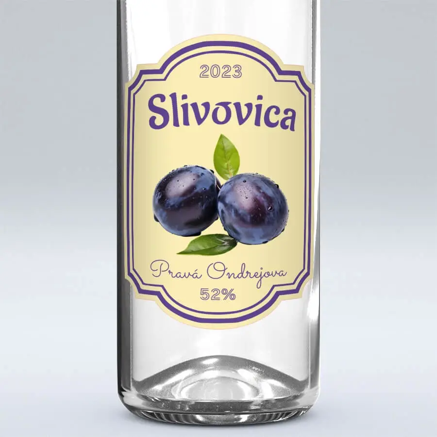 Vyrezávaná samolepiaca etiketa na domáci alkohol (slivovica), ktorú tlačíme na kvalitné samolepiace fólie vhodné do vlhkých priestorov.