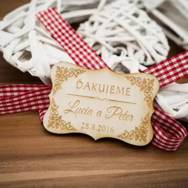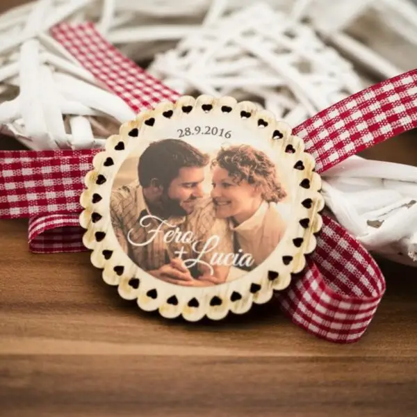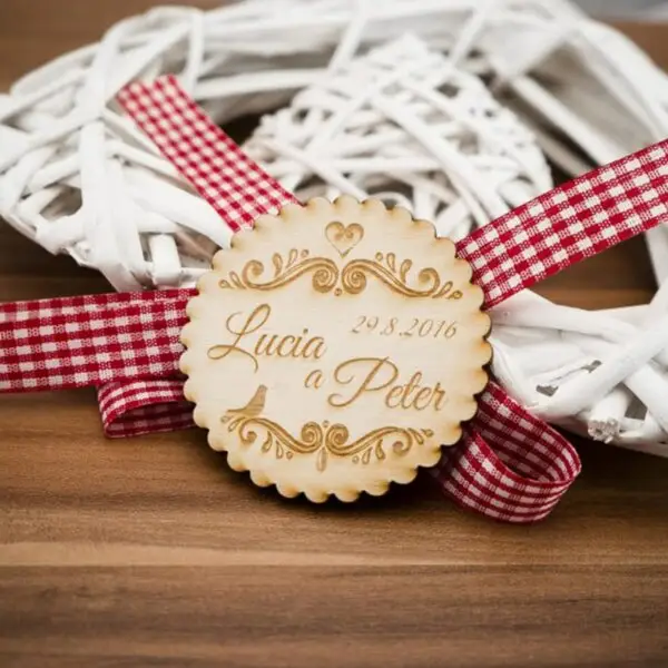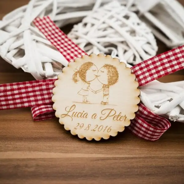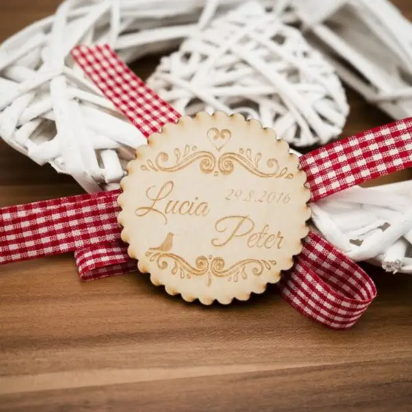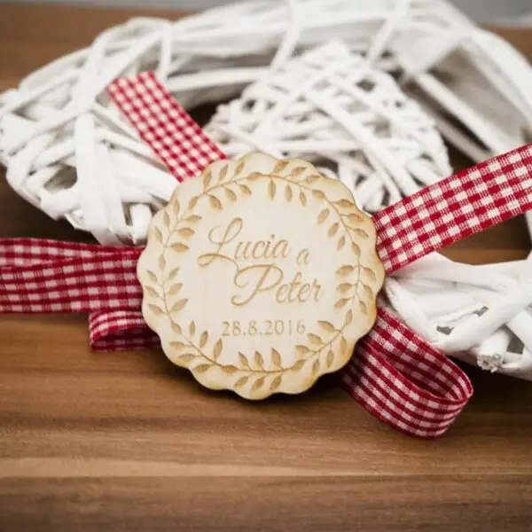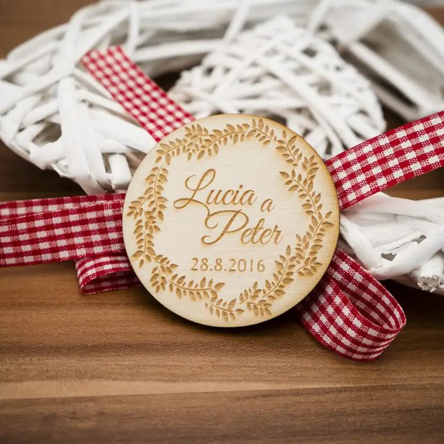 Drevená svadobná magnetka s priemerom 6cm a hrúbkou 3mm.