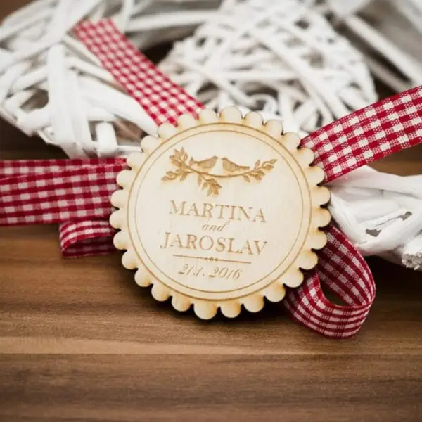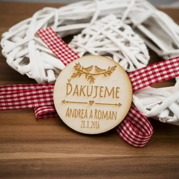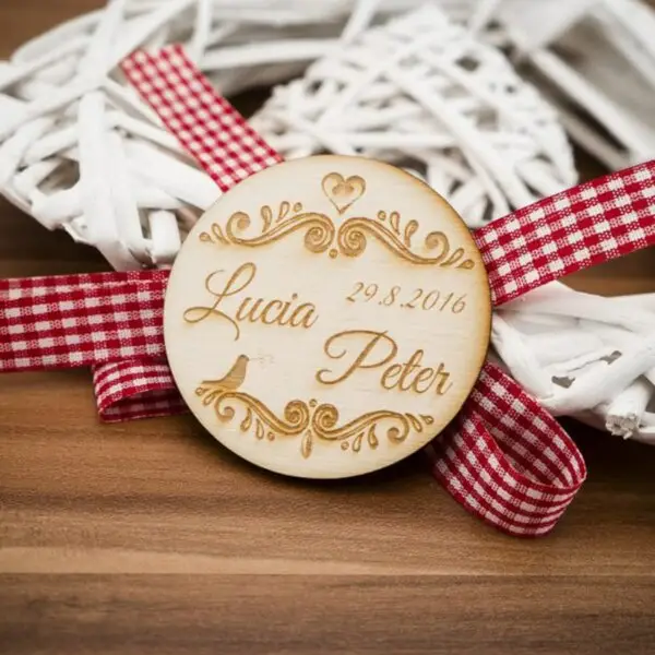 Drevená svadobná magnetka s priemerom 6cm a hrúbkou 3mm.