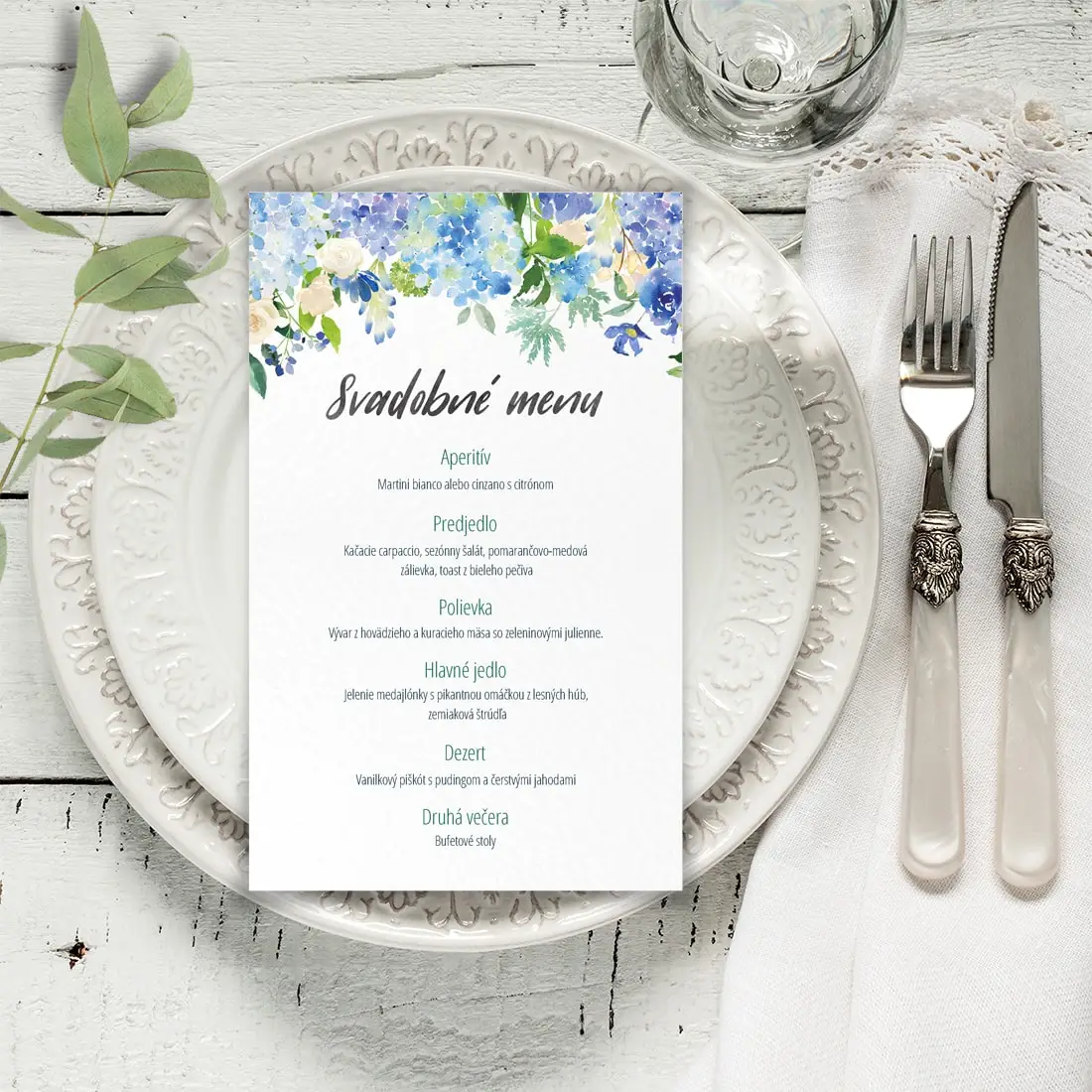 Netradičný, kreatívny a romantický kvetinový dizajn svadobnej menu karty. Jednoduchý a elegantný motív. Pripojte text Vášho jedálneho lístka a my Vám vypracujeme návrh, ktorý Vám pošleme emailom na odsúhlasenie. K menu kartám sú zladené aj ostatné svadobné tlačoviny ako svadobné oznámenie, etikety na fľaše, pozvánky k stolu, menovky a ďalšie, ktoré nájdete nižšie ako súvisiace produkty.