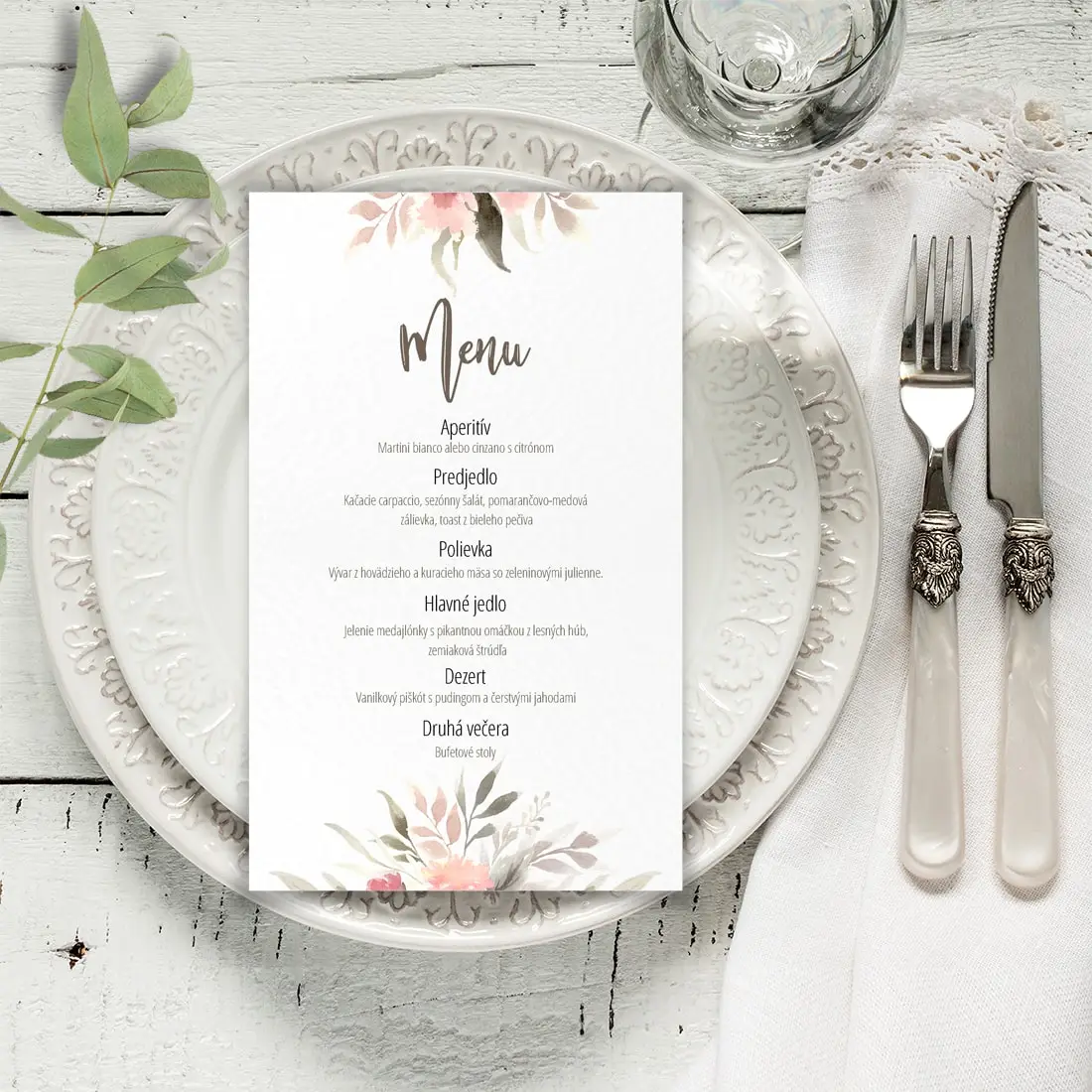 Netradičný, kreatívny a moderný kvetinový dizajn svadobnej menu karty. Jednoduchý a elegantný motív. Pripojte text Vášho jedálneho lístka a my Vám vypracujeme návrh, ktorý Vám pošleme emailom na odsúhlasenie. K menu kartám sú zladené aj ostatné svadobné tlačoviny ako svadobné oznámenie, etikety na fľaše, pozvánky k stolu, menovky a ďalšie, ktoré nájdete nižšie ako súvisiace produkty.
