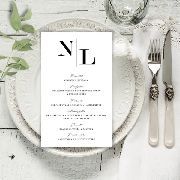 Netradičný, kreatívny a moderný dizajn svadobnej menu karty. Jednoduchý a elegantný motív. Pripojte text Vášho jedálneho lístka a my Vám vypracujeme návrh, ktorý Vám pošleme emailom na odsúhlasenie. K menu kartám sú zladené aj ostatné svadobné tlačoviny ako svadobné oznámenie, etikety na fľaše, pozvánky k stolu, menovky a ďalšie, ktoré nájdete nižšie ako súvisiace produkty.
