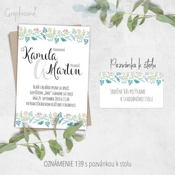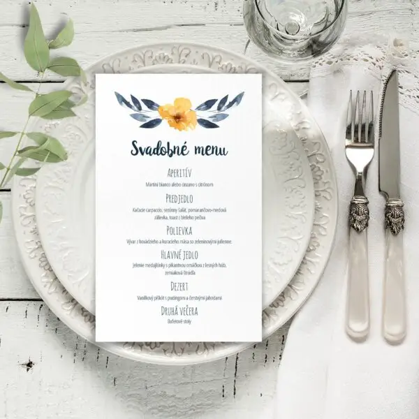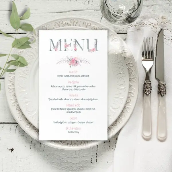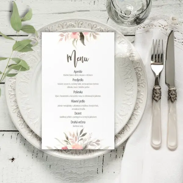 Netradičný, kreatívny a romantický kvietkovaný dizajn svadobnej menu karty. Jednoduchý a elegantný motív. Pripojte text Vášho jedálneho lístka a my Vám vypracujeme návrh, ktorý Vám pošleme emailom na odsúhlasenie. K menu kartám sú zladené aj ostatné svadobné tlačoviny ako svadobné oznámenie, etikety na fľaše, pozvánky k stolu, menovky a ďalšie, ktoré nájdete nižšie ako súvisiace produkty.