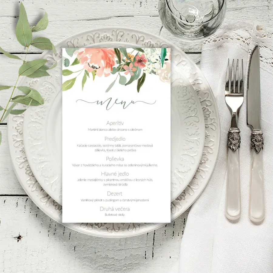 Netradičný, kreatívny a romantický kvetinový svadobnej menu karty. Jednoduchý a elegantný motív. Pripojte text Vášho jedálneho lístka a my Vám vypracujeme návrh, ktorý Vám pošleme emailom na odsúhlasenie. K menu kartám sú zladené aj ostatné svadobné tlačoviny ako svadobné oznámenie, etikety na fľaše, pozvánky k stolu, menovky a ďalšie, ktoré nájdete nižšie ako súvisiace produkty.