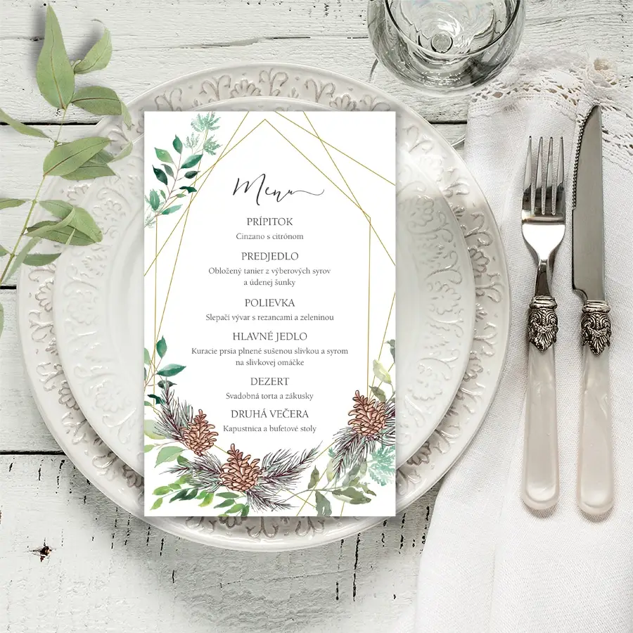 Netradičný, kreatívny a naturálny dizajn svadobnej menu karty. Jednoduchý a elegantný motív. Pripojte text Vášho jedálneho lístka a my Vám vypracujeme návrh, ktorý Vám pošleme emailom na odsúhlasenie. K menu kartám sú zladené aj ostatné svadobné tlačoviny ako svadobné oznámenie, etikety na fľaše, pozvánky k stolu, menovky a ďalšie, ktoré nájdete nižšie ako súvisiace produkty.