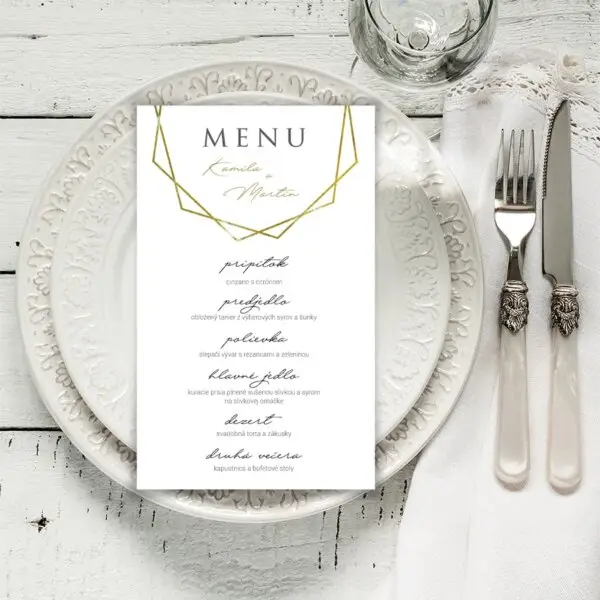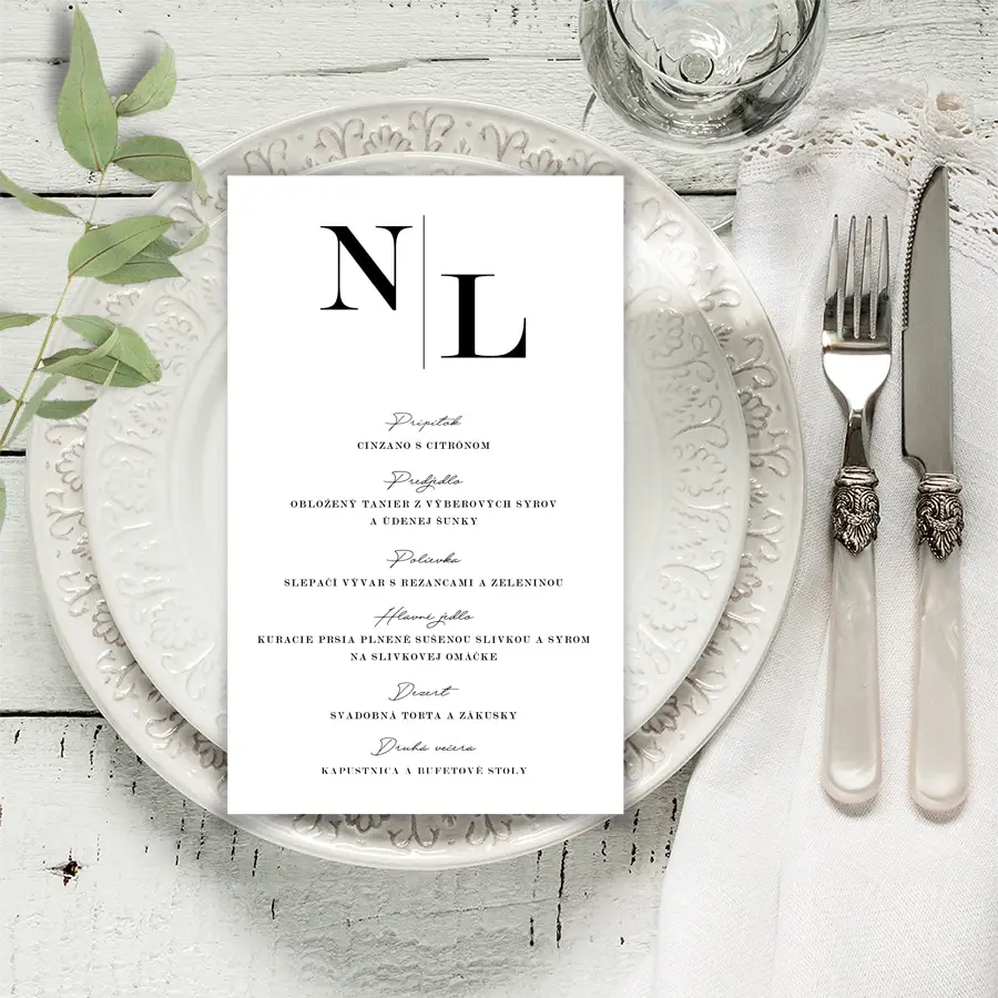 Netradičný, kreatívny a moderný minimalistický dizajn svadobnej menu karty. Jednoduchý a elegantný motív. Pripojte text Vášho jedálneho lístka a my Vám vypracujeme návrh, ktorý Vám pošleme emailom na odsúhlasenie. K menu kartám sú zladené aj ostatné svadobné tlačoviny ako svadobné oznámenie, etikety na fľaše, pozvánky k stolu, menovky a ďalšie, ktoré nájdete nižšie ako súvisiace produkty.