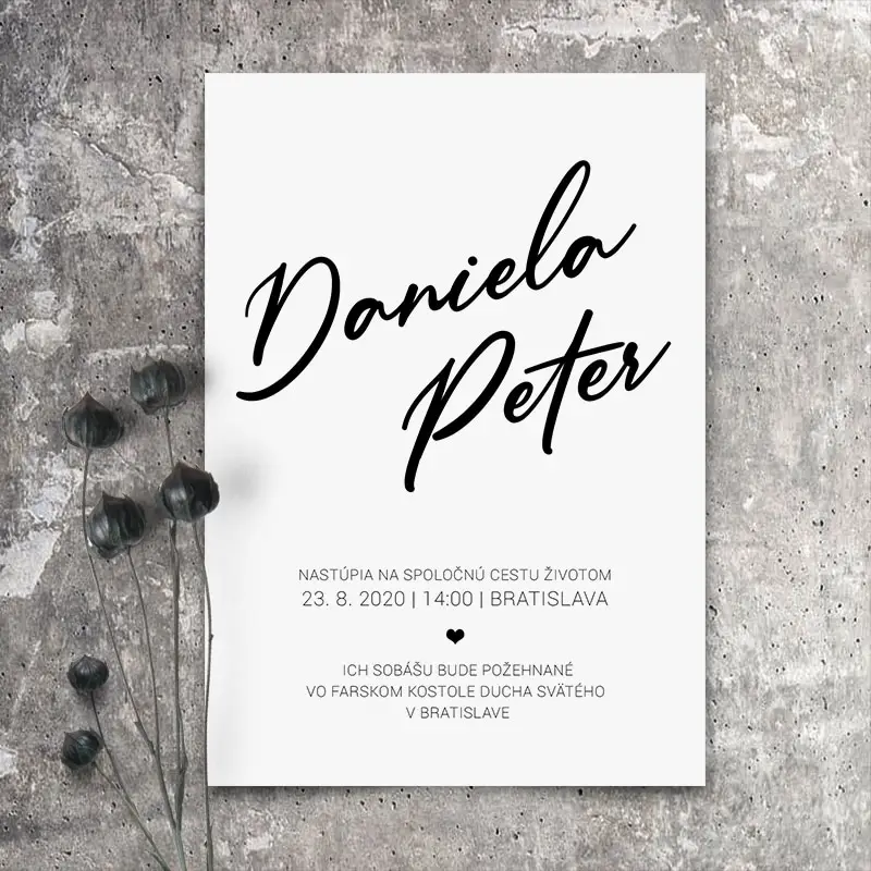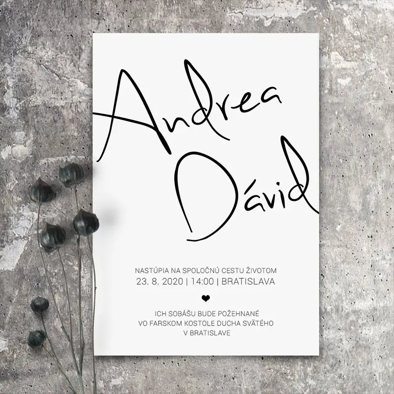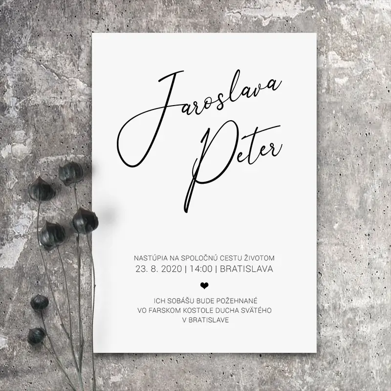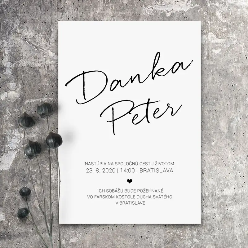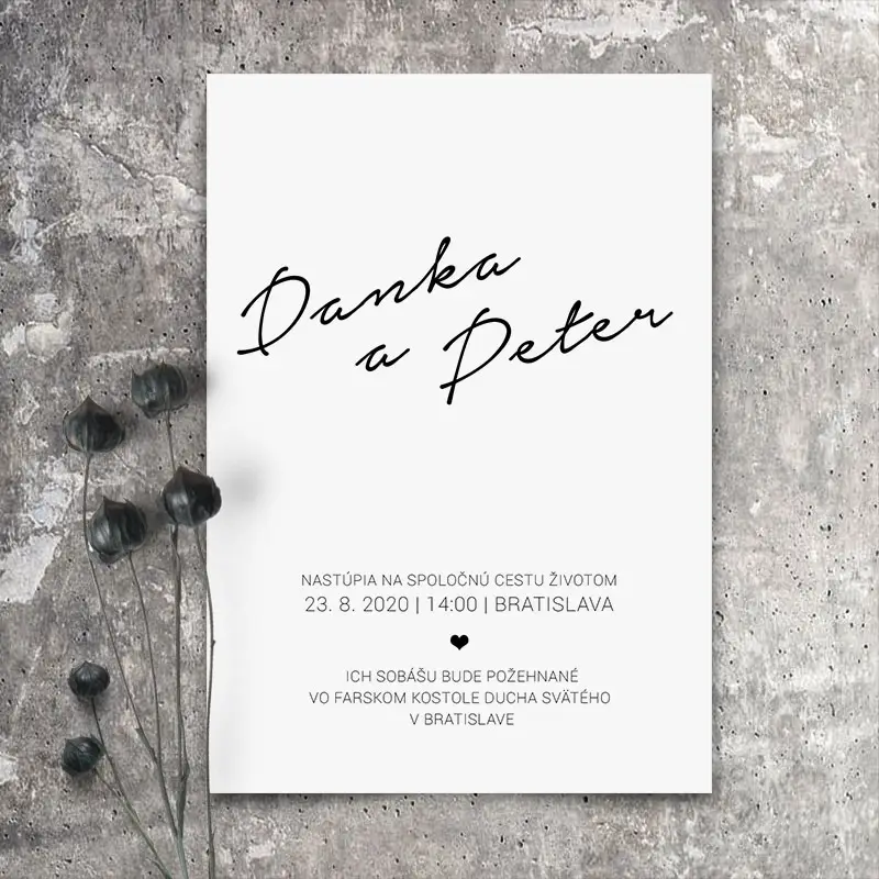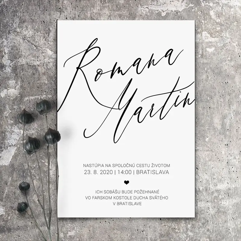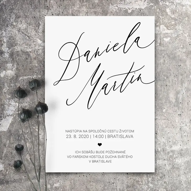 Jednoduché, kreatívne a moderné svadobné oznámenie s elegantným a minimalistickým čiernym srdiečkom. K oznámeniu sú zladené aj ostatné svadobné tlačoviny, ako pozvánka k stolu, etikety na fľaše, menovky, menu karta a ďalšie, ktoré nájdete nižšie ako súvisiace produkty. K dispozícii sú v rôznych variantoch.