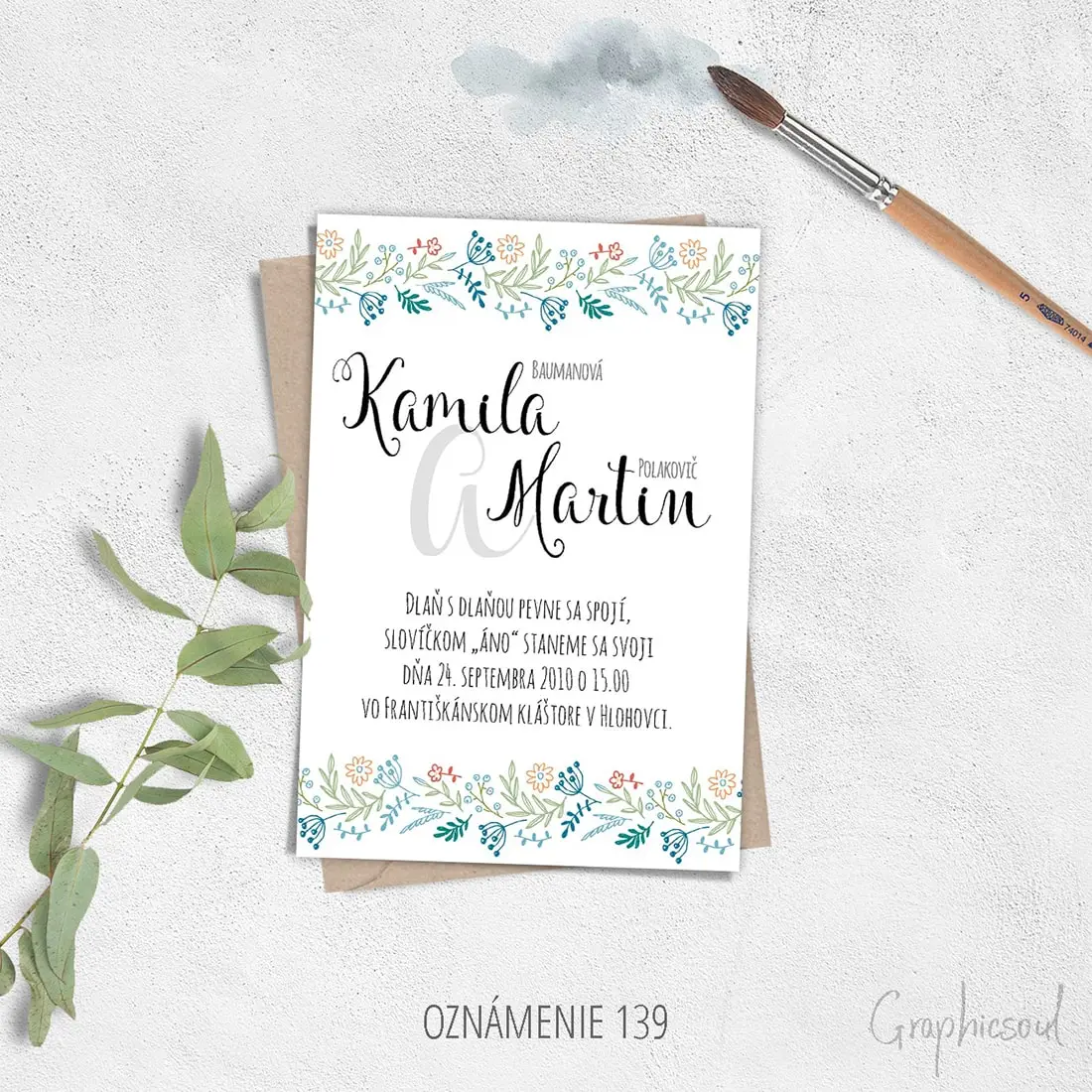 Netradičné, kreatívne a moderné svadobné oznámenie s kresleným prírodným kvetovým motívom. K oznámeniu sú zladené aj ostatné svadobné tlačoviny, ako pozvánka k stolu, etikety na fľaše, menovky, menu karta a ďalšie, ktoré nájdete nižšie ako súvisiace produkty.