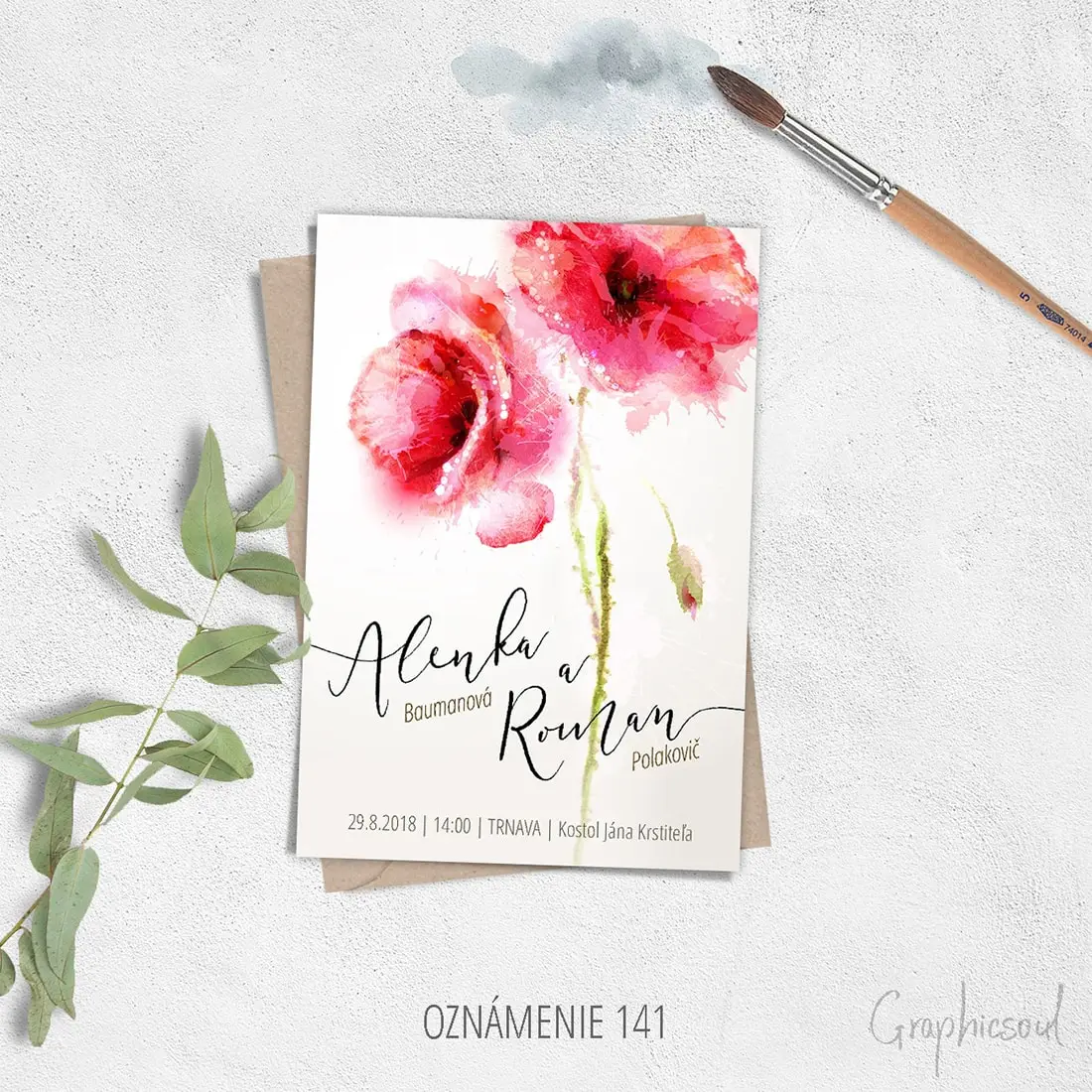 Netradičné, kreatívne a moderné svadobné oznámenie s motívom vlčích makov. K oznámeniu sú zladené aj ostatné svadobné tlačoviny, ako pozvánka k stolu, etikety na fľaše, menovky, menu karta a ďalšie, ktoré nájdete nižšie ako súvisiace produkty.