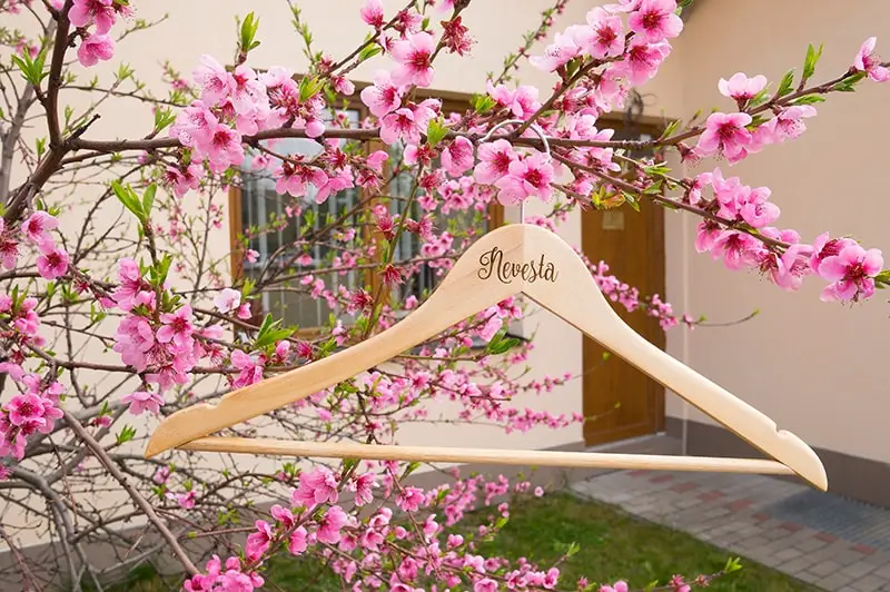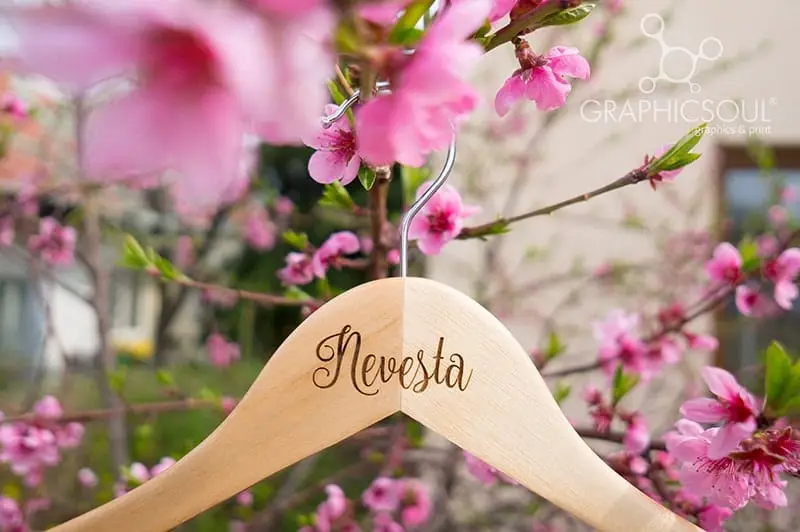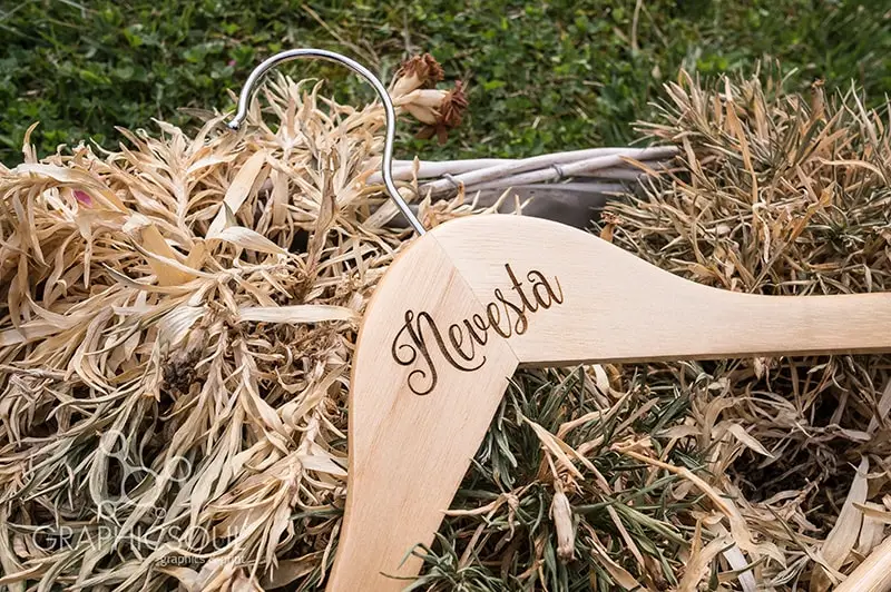 Drevený svadobný vešiak s vygravírovaným nápisom Nevesta alebo Ženích bude milým detailom na Vašich fotkách.